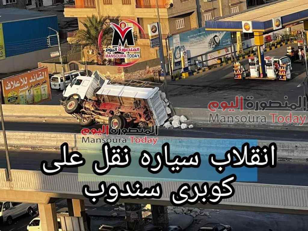 انقلبت سيارة نقل محملة بالطوب اليوم الجمعة أعلى كوبري سندوب بمدينة المنصورة، في محافظة الدقهلية.