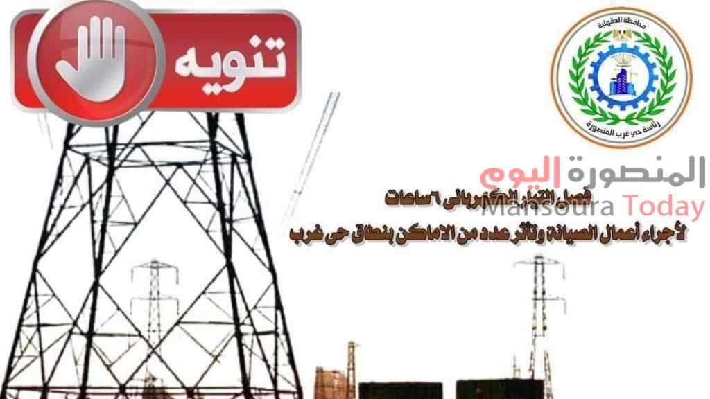 اعلنت رئاسة حى غرب المنصورة ، برئاسة المحاسب متولى عبد العال رئيس حى غرب المنصورة ، بناء عن اخطار شركة شمال الدلتا لتوزيع الكهرباء ، بانه سيتم فصل التيار الكهربائي ، من الساعة ٩ صباحا ” حتى الساعة ٣ عصرا” وتأثر عدد من الاماكن بنطاق حى غرب المنصورة ، وذلك ابتداء من يوم السبت الموافق٢٠-٨-٢٠٢٢ حتى يوم الخميس الموافق ٢٥-٨-٢٠٢٢ ، وذلك لأجراء أعمال الصيانة بالمحولات وفقا” لبرنامج الصيانة للحفاظ عل جودة التغذية الكهربائية للمشتركين .