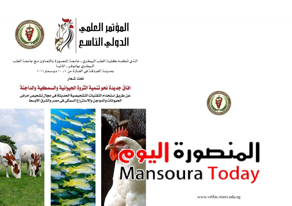 تنظم كلية الطب البيطرى جامعة المنصورة بالتعاون مع جامعة هانوفر بألمانيا المؤتمر الدولى التاسع تحت شعار “آفاق جديدة نحو تنمية الثروة الحيوانية والسمكية والداجنة ” فى الفترة من 7-10 ديسمبر 2016 بمدينتى المنصورة والغردقة