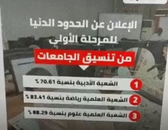 في البداية أبعث بخالص التهنئة لكل بناتي وأبنائي والأسر المصرية علي ما حققه الطلاب الناجحون في امتحانات الثانوية العامة (الدور الأول) لهذا العام 2023 من نجاح وتفوق، والذين تم إعلان نتائجهم يوم الأحد الموافق 31/7/2023، وبهذه المناسبة فقد تقرر فتح موقع التنسيق الإلكتروني لتسجيل الرغبات للمرحلة الأولى لهؤلاء الطلاب اعتبارًا من يوم السبت الموافق 5/8/2023 وحتى يوم الأربعاءالموافق 9/8/2023 وذلك وفقًا للحد الأدنى التالي:-