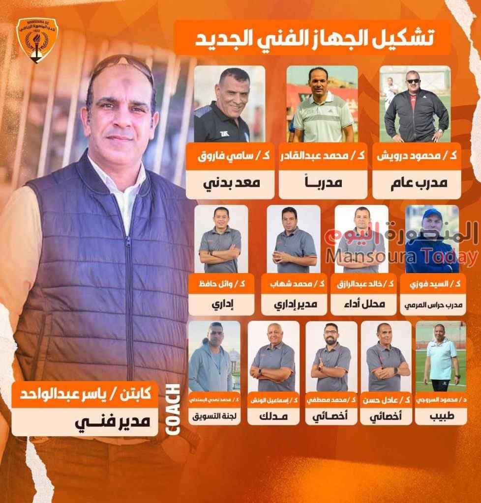 أعلن نادي المنصورة الرياضي، برئاسة العميد محمد البسيوني، عن اعتماد التشكيل الرسمي للجهاز الفني والإداري والطبي للفريق الأول لكرة القدم، وذلك استعدادًا للموسم الكروي الجديد، حيث جاء التشكيل بناءً على اختيارات المدير الفني الكابتن ياسر عبد الواحد.