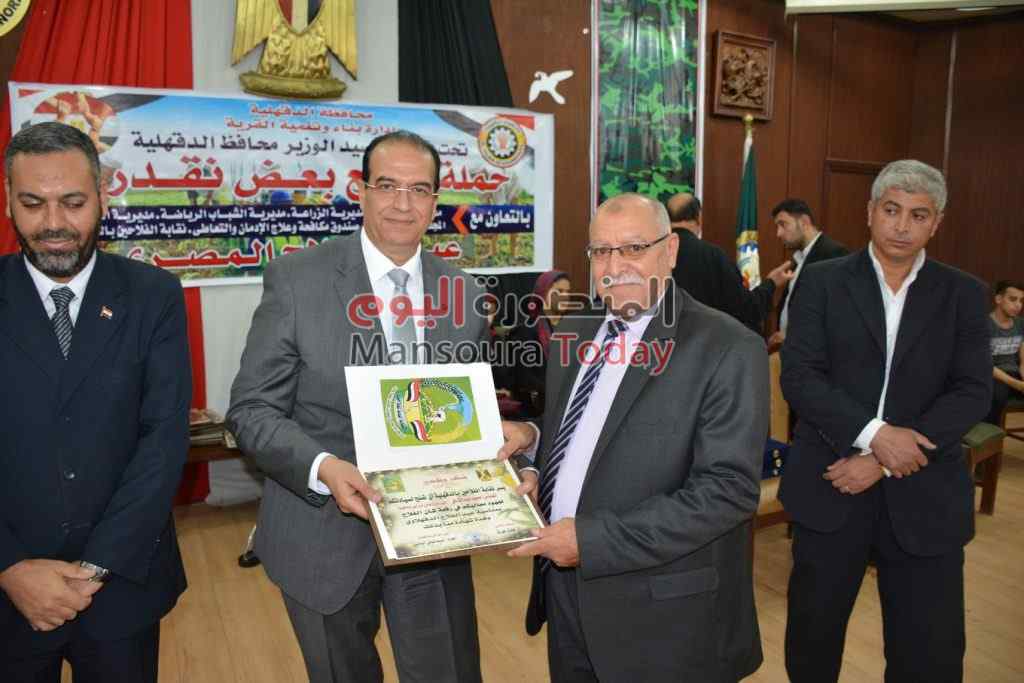 وفى نهايه الاحتفالية كرم المحافظ عدد 20 مزارعا وفلاحا من المتميزين في زراعة المحاصيل الزراعية بالدقهليه وكذا تكريم التنفيذيين بمديريات الزراعه والرى والبيطرى وقطاع البيئه بان منحهم شهادات التقدير ودروع التميز ، وقدمت نقابه الفلاحين درعا للمحافظ تقديرا لجهوده فى رعايه قضايا الفلاحين ، وسلم المحافظ شهادات التقدير للدكتور زغلول خضر، والدكتورة ساميه محرز، تسلمها عنها الدكتور زغلول خضر مساعد نائب وزير الزراعة .