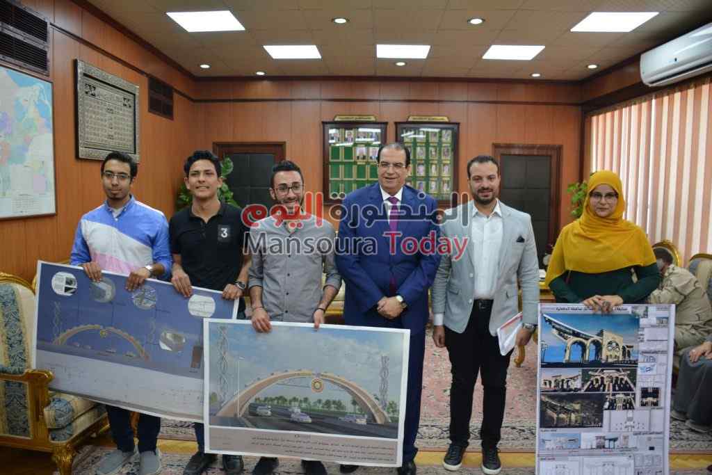 جاء ذلك خلال تكريم المحافظ، للفرق الفائزة بتصميمات هندسيه متطورة لمداخل مدينة المنصورة والتي تم اجرائها بتكليف الدكتور مهند فودة، المدرس بكلية الهندسة، وبإشراف الاستاذ الدكتور محمد السعيد، عميد هندسه المنصورة، حيث تم اجراء المسابقة من خلال قسم العمارة بالكلية وتقدم للمسابقة خمسه مشروعات تصميم فاز منها تصميمين من خلال لجنه تحكيم برئاسة الدكتورة إيناس الجيزاوى، والمشروعين الفائزين الأول من تصميم أميره مدحت جوده، خريجة قسم العمارة بالكلية، والثاني من تصميم ثلاث طلاب بالسنة الثانية بقسم العمارة أمجد ابراهيم دراز، محمد عبد العزيز أبو الاسعاد، فادى احمد السيد عيد.