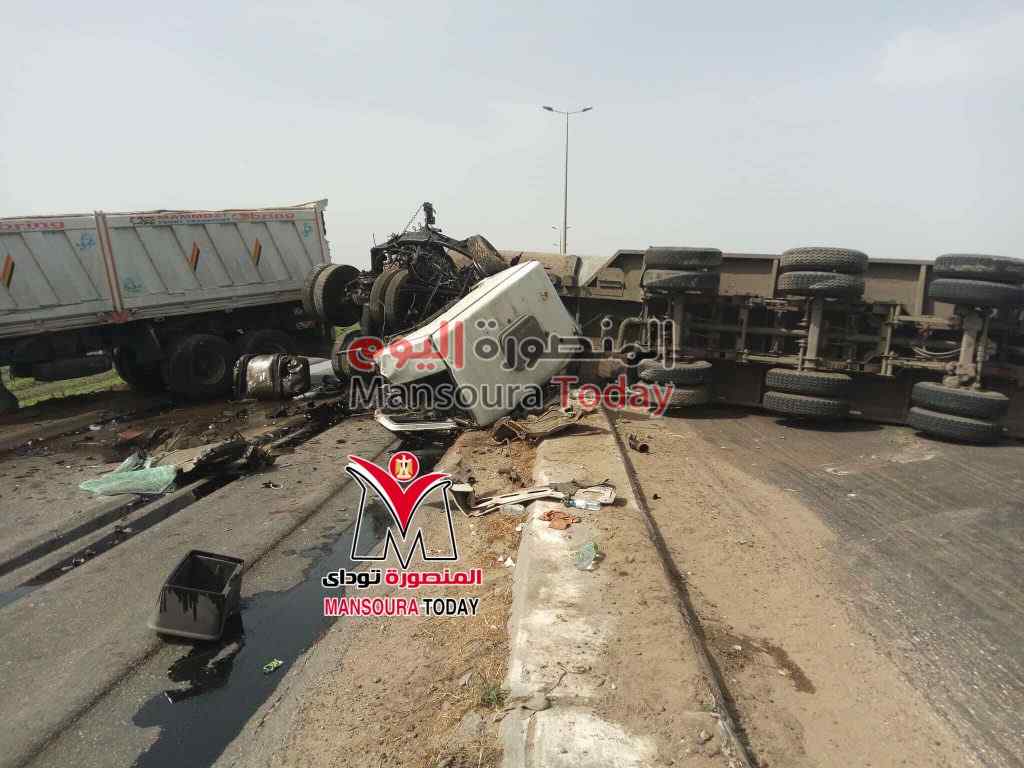 بالصور ..إغلاق طريق جمصة الدولي بعد انقلاب سيارتين نقل