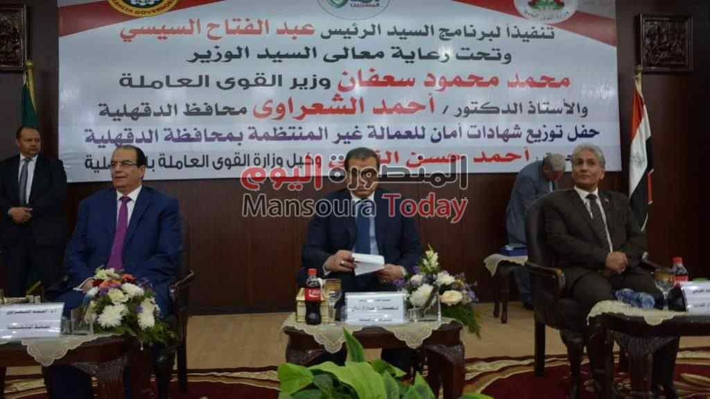 جاء ذلك خلال حضور محافظ الدقهلية، ووزير القوي العاملة، احتفاليه تسليم شهادة “أمان” للعمالة الغير منتظمة من أبناء الدقهلية والتي اقيمت بالقاعة الكبرى بديوان المحافظة.