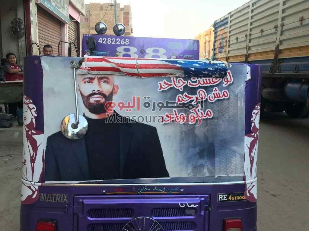 توك توك الزفة مزين بعدد من “الإفيهات” التي رددها الفنان محمد رمضان بمسلسل الاسطورة ومنها” لو عشت جاحد مش هرحم منكو واحد” وعليه صورة للممثلة العالمية الشهيرة مارلين مونرو .