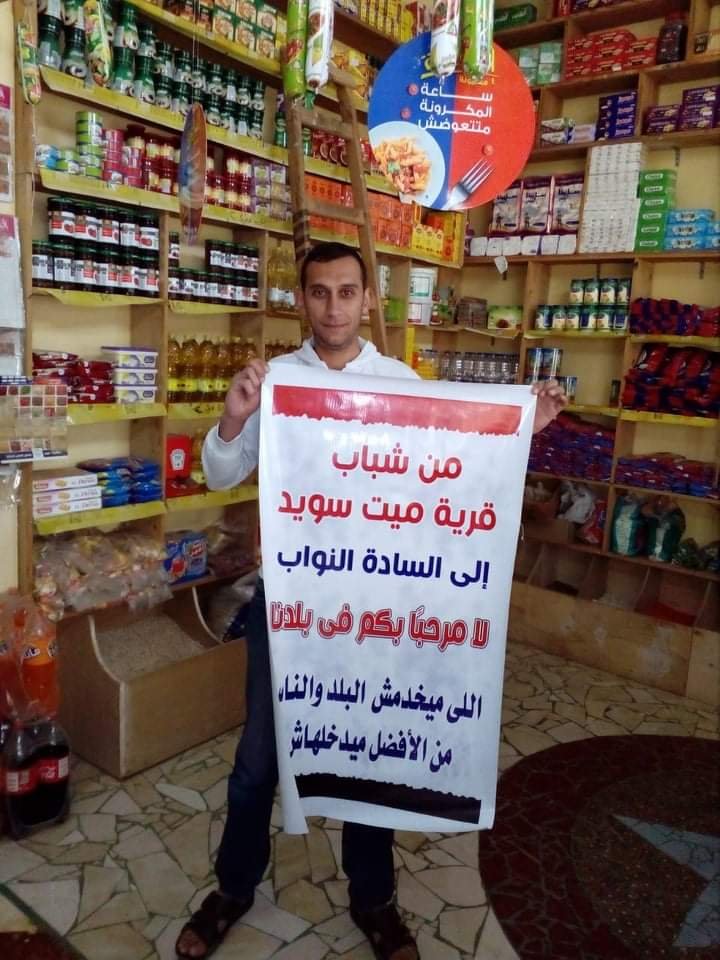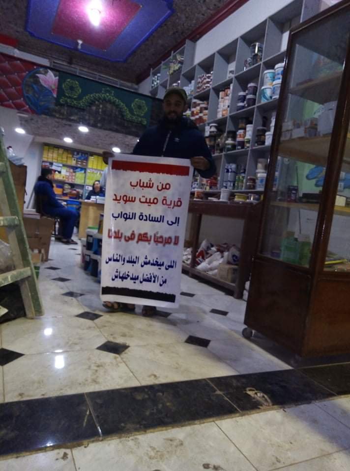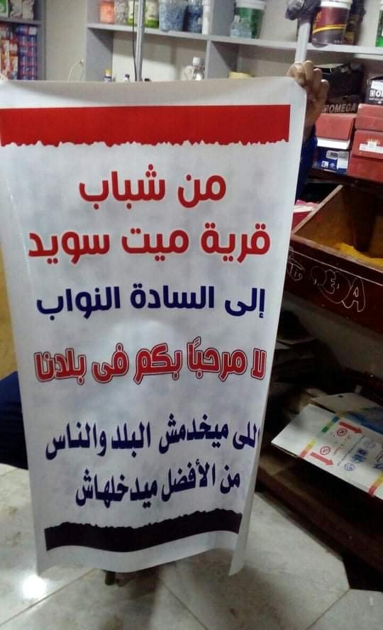 قرر عدد من أهالى قرية ميت سويد التابعة لمركز دكرنس بمحافظة الدقهلية ، تعليق لافتة على مدخل القرية مدون عليها:”السادة أعضاء مجلس النواب لا مرحبا بكم في بلدنا.. اللي ميخدمش البلد والناس من الأفضل ميدخلهاش”.