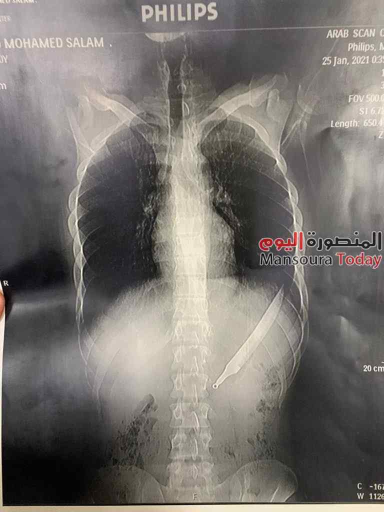 وأشار الدكتور إيهاب فى تصريح خاص ل “المنصورة توداى” أن المريض وصل لمستشفى المنصورة الدولى مريض من أجا 20 عاما مع أسرته يعانى من آلام شديدة، وبسؤاله أكد أنه ابتلع سكينة أثناء الأكل وتم عمل الأشعات اللازمة ولم نتخيل أنها سكينة كاملة لكننا تخيلنا أنه بلع جزء من السكين، واستغربنا بعد نتيجة الأشعة، وكان لابد من التأكد من عدم وجود مشاكل بسبب ابتلاعها فى البلعوم أو المرئ أثناء نزولها وهذا يعطى إيحاء أنها ابتلعت بالإتجاه المعاكس لأنها لو ابتلعت بالإتجاه الحاد كانت ستتسبب فى مشاكل كثيرة وقد تؤدى إلى وفاته، لأن طولها 28 سم.