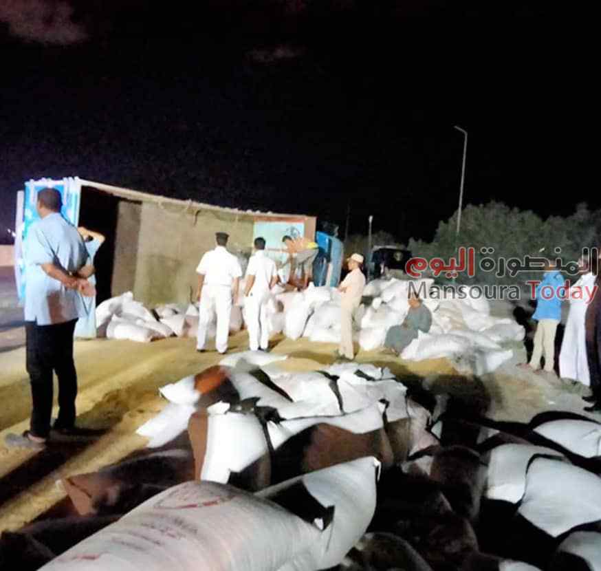 تلقي اللواء مدير أمن الدقهلية اخطارا من اللواء مدير المباحث الجنائية بورود بلاغ من مركز شرطة جمصة بانقلاب سيارة محملة بالأعلاف أمام جامعة المنصورة الاهلية.