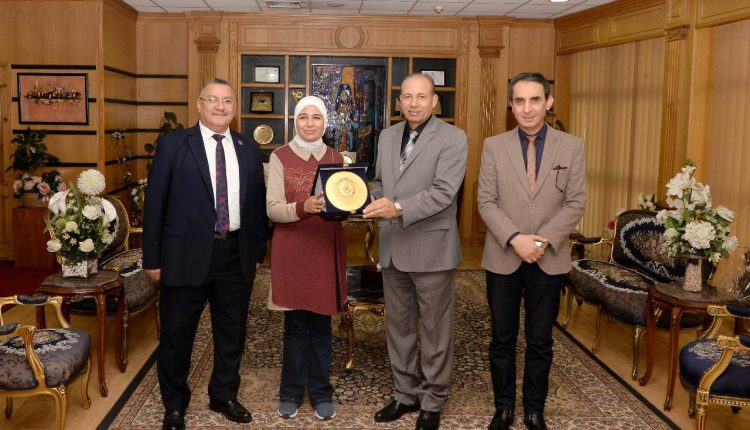 كرم الدكتور شريف يوسف خاطر رئيس جامعة المنصورة الباحثة رنا حامد عوضين التى حصلت على درجة الدكتوراه في الأدب الانجليزي بمرتبة الشرف الأولى من كلية الآداب ، وهى أول طالبة كفيفة تقهر الظلام وتحقق هذا الإنجاز .