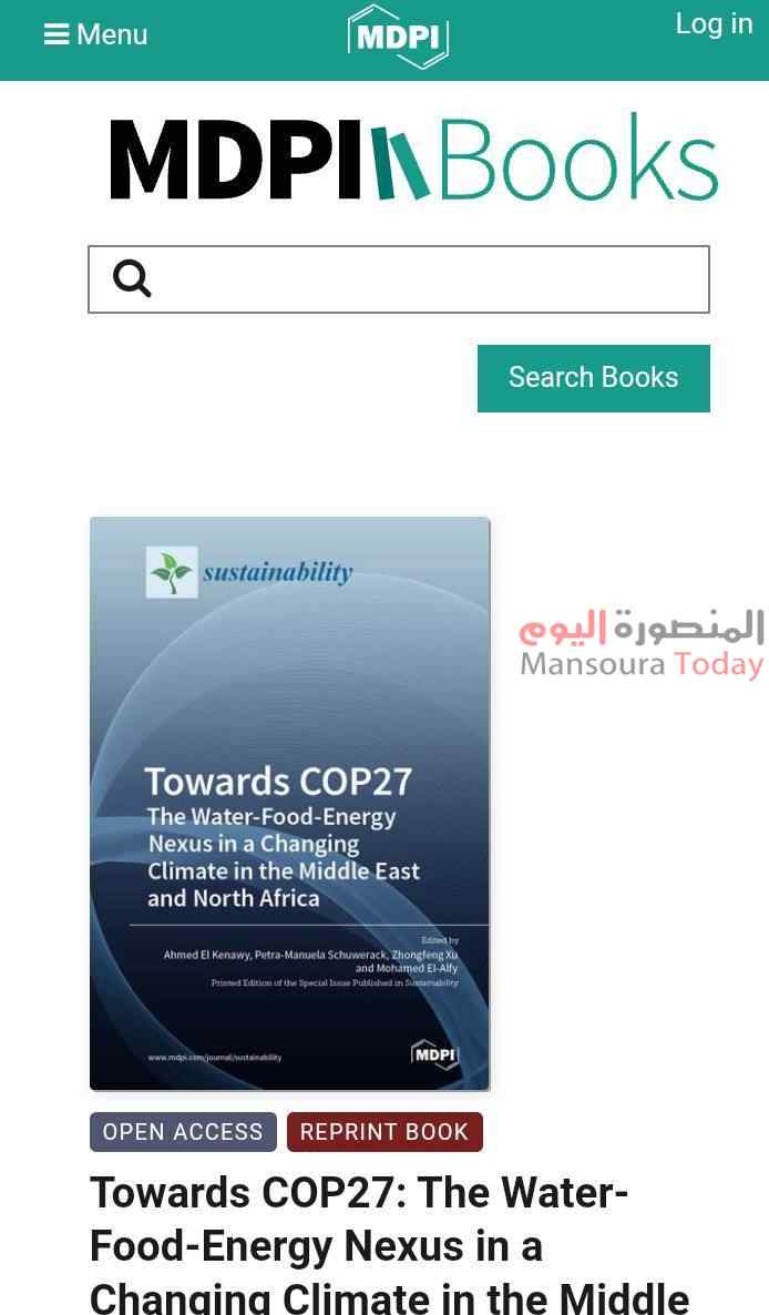 صدر كتاب دولي عن دار النشر MDPI، يضم مجموعة من الأبحاث المتميزة التي تناقش قضايا التغيرات المناخية و الهيدرولوجية في منطقة شمال أفريقيا و الشرق الأوسط – مع التركيز علي مصر- و تقييم تأثيراتها علي بعض القطاعات الحيوية كالمياه والطاقة وإنتاج الغذاء، وقد ضم الكتاب 23 بحثاُ لباحثين من جامعات مصرية و عربية و دولية مختلفة، وقد قامت جامعة المنصورة بالتعاون مع دار النشر الدولية بتحمل تكاليف نشر تلك الأبحاث.
