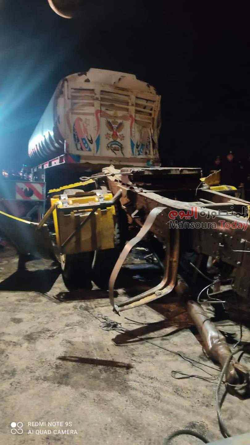 انقلبت سيارتي نقل على طريق رافد جمصه نتيجة انعدام الرؤية بسبب الشبوره المائية الكثيفه فى الساعات الاولى من صباح اليوم الثلاثاء ادى الى انقلاب الشاحنتين بنهر الطريق بمشمول حمولتهما . تلقت اللجهزة الامنية في الدقهلية اخطاا يفيد بوقوع حادث تصادم بين سيارتي نقل علي طريق رافد جمصة و وقوع مصابين . تم التعامل مع الحادث و نقل المصابين الى مستشفى الطوارئ بالمنصورة وتم استخدام معدات رئاسة المركز فى فتح الطريق واعادة حركة المرور الى طبيعتها وذلك بالتنسيق بين رئاسة مركز ومدينة طلخا رئاسة محمد امين الدمرداش رئيس مركز ومدينة طلخا وقيادات ادارة مرور الدقهلية وتحرر عن ذلك المحصر الازم للعرض علي النيابة العامة لمباشرة التحقيقات