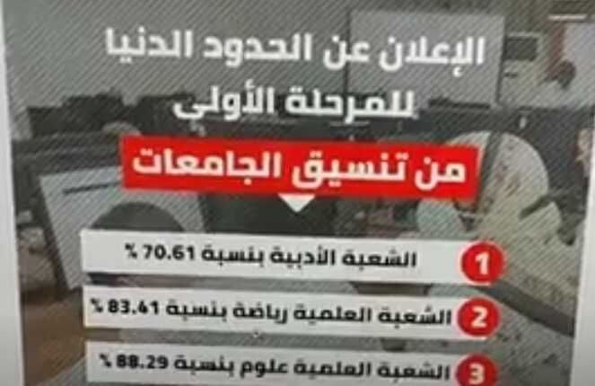 في البداية أبعث بخالص التهنئة لكل بناتي وأبنائي والأسر المصرية علي ما حققه الطلاب الناجحون في امتحانات الثانوية العامة (الدور الأول) لهذا العام 2023 من نجاح وتفوق، والذين تم إعلان نتائجهم يوم الأحد الموافق 31/7/2023، وبهذه المناسبة فقد تقرر فتح موقع التنسيق الإلكتروني لتسجيل الرغبات للمرحلة الأولى لهؤلاء الطلاب اعتبارًا من يوم السبت الموافق 5/8/2023 وحتى يوم الأربعاءالموافق 9/8/2023 وذلك وفقًا للحد الأدنى التالي:-
