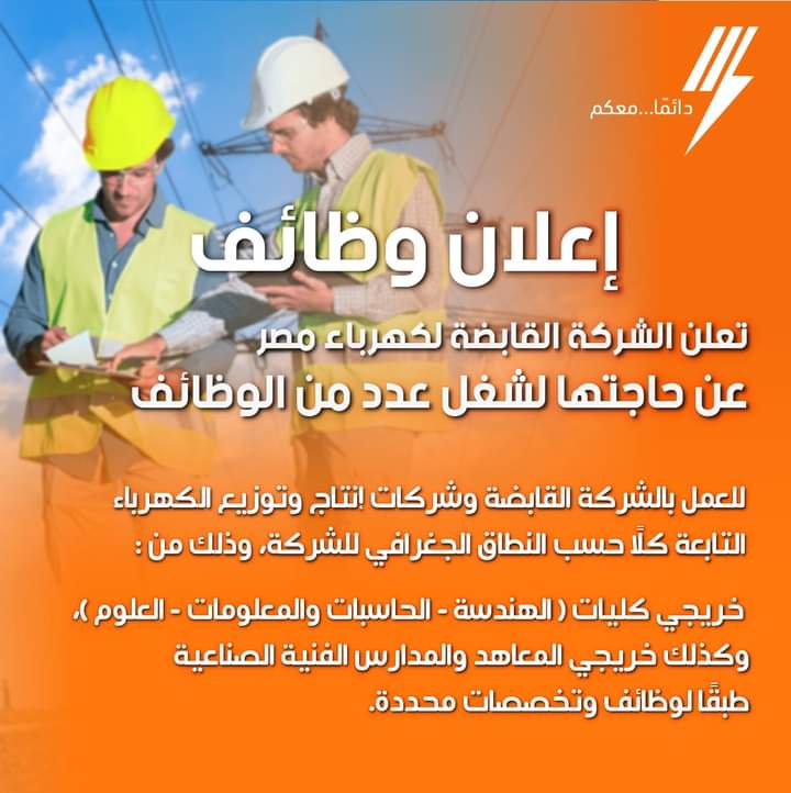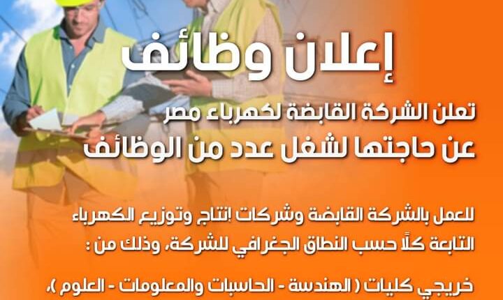 تعلن الشركة القابضة لكهرباء مصر عن حاجتها لشغل عدد من الوظائف للعمل بالشركة القابضة، وشركات إنتاج وتوزيع الكهرباء التابعة، كلًا حسب النطاق الجغرافي لكل شركة، وذلك من خريجى كليات الهندسة، والحاسبات والمعلومات، والعلوم، وكذلك خريجي المعاهد، والمدارس الفنية الصناعية، طبقا لعدد من التخصصات.
