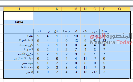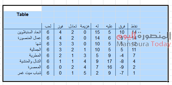 يتصدر إتحاد السنبلاوين قمة المجموعة الأولى برصيد ١٤ نقطه وهو نفس رصيد العمال
