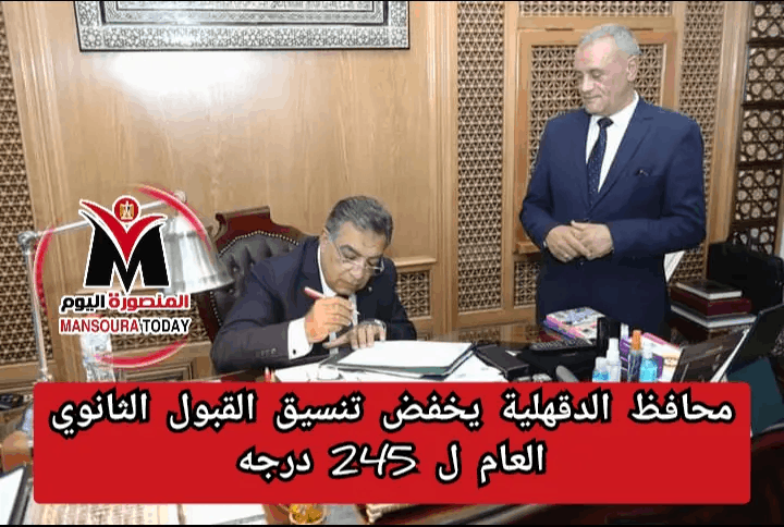 وقع اللواء طارق مرزوق محافظ الدقهلية ، اليوم الثلاثاء بالموافقة على تخفيض درجات تنسيق القبول بالصف الأول الثانوى العام ، للعام الدراسى 2025/2024 لمجموع 245 درجة للحاصلين على الشهادة الإعدادية .