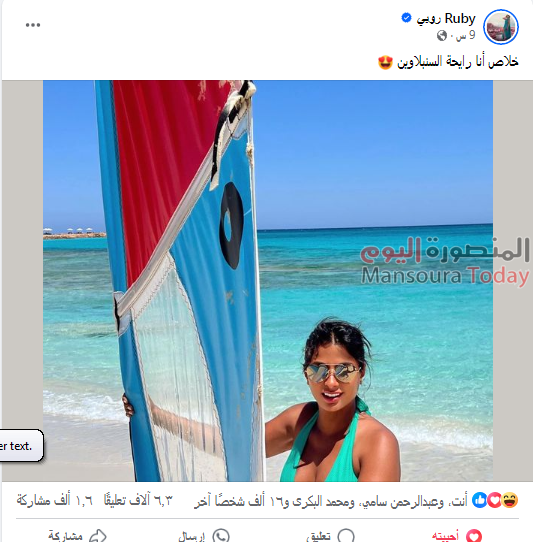 وعلقت روبي على الصورة عبر صفحتها الرسمية على موقع التواصل الاجتماعي فيس بوك وكتبت قائلة، “أنا رايحة السنبلاوين”.