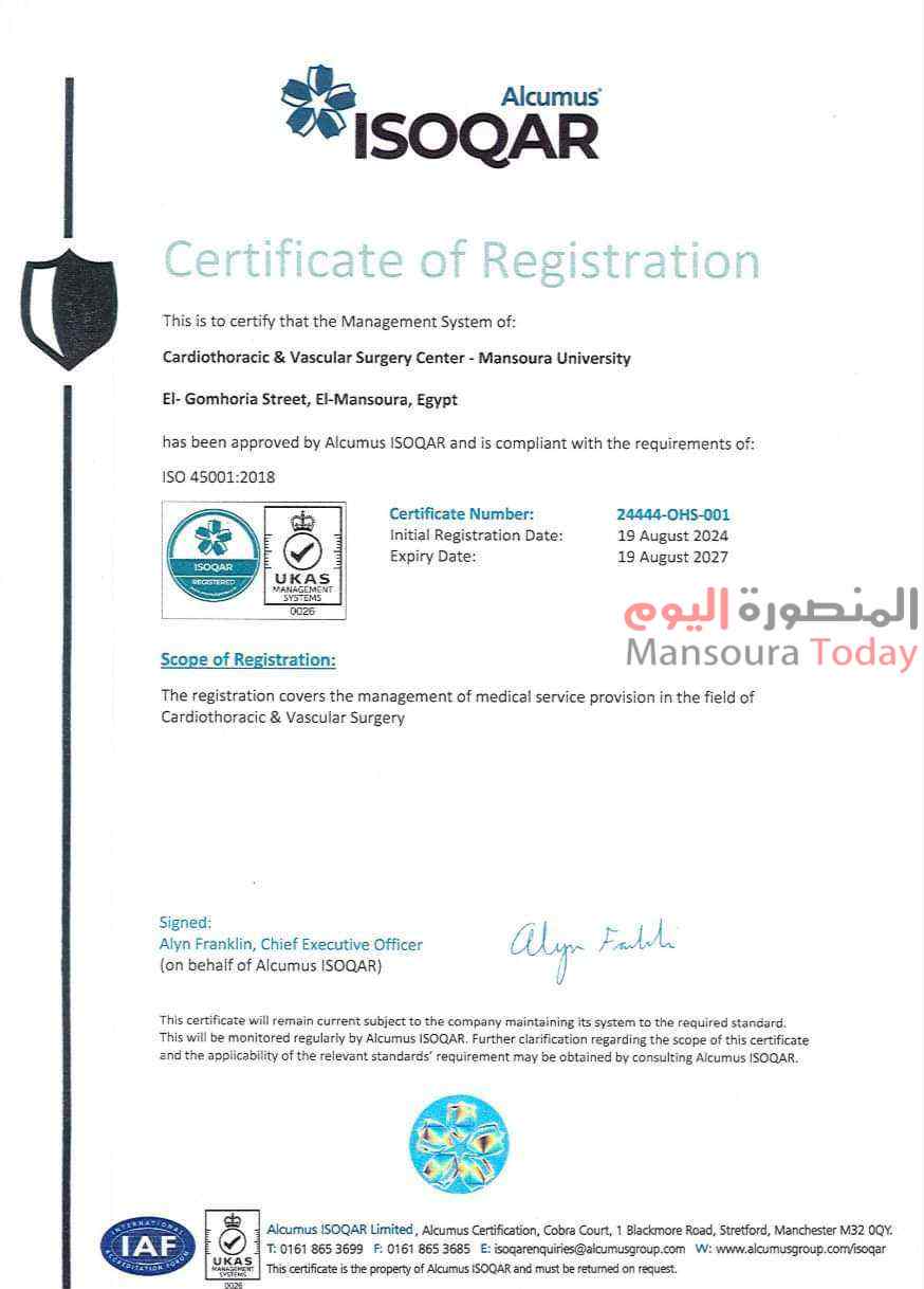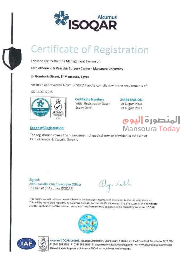 أعلن الأستاذ الدكتور شريف يوسف خاطر رئيس جامعة المنصورة اليوم الأربعاء ٢ أكتوبر ٢٠٢٤ حصول مركز جراحة القلب و الصدر و جراحة الأوعية الدموية بجامعة المنصورة على الإعتماد الأسترالي للخدمات الصحية للمستشفيات ليعتبر بذلك أول مركز طبي جامعي يحصل على الإعتماد الأسترالي و كذلك حصول المركز على شهادات الأيزو ٩٠٠١ و ١٤٠٠١ و ٤٥٠٠١ و ٢٢٠٠٠