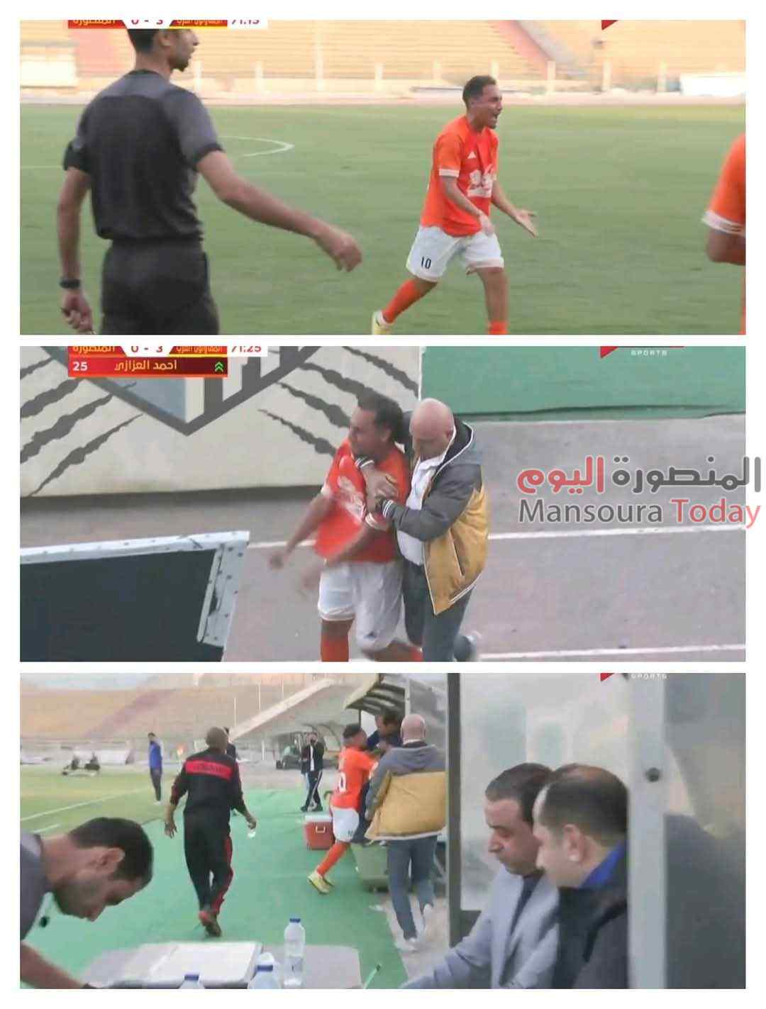 وشهدت المباراة واقعة غريبة وغير مسبوقة، حيث أثار تغيير أجراه علاء نوح المدير الفني للمنصورة أزمة كبيرة داخل الملعب عندما قرر المدرب استبدال اللاعب أحمد شاهين، الذي رفض الخروج من الملعب بشكل قاطع. تدخل حكم المباراة لإيقاف اللعب في محاولة لحل الأزمة وإخراج اللاعب، إلا أن شاهين واصل اعتراضه بشكل علني.