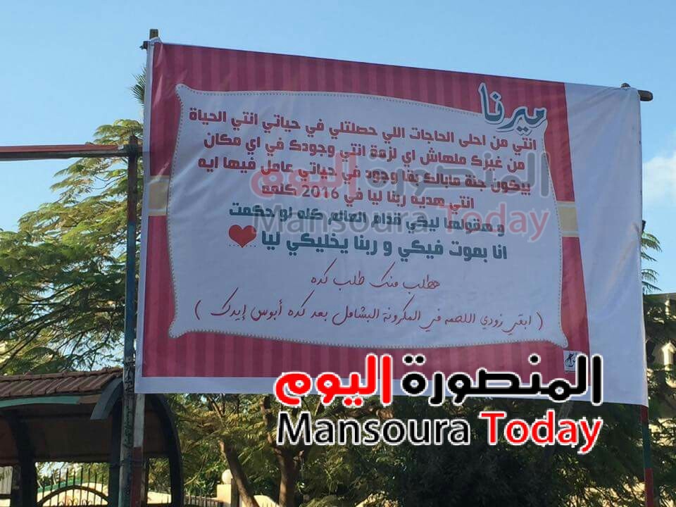 وقام أحد الأشخاص رفض ذكر اسمه بمدينة المنصورة بتعليق لافتة كبيرة باسم خطيبته «ميرنا» أمام نادي «جزيرة الورد» بمدينة المنصورة .