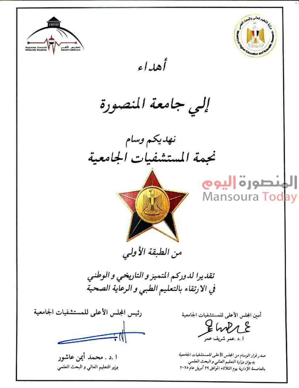 ويُمثِّل حصول مستشفيات جامعة المنصورة على درع “نجمة المستشفيات الجامعية” تتويجًا مستحقًّا لجهودٍ متواصلة وشهادةَ ثقةٍ في قدراتها المؤسسية ورسالةً واضحةً بأن الاستثمار في التعليم الطبي المتطور والخدمة الصحية الشاملة هو السبيل إلى الريادة في القطاع الصحي الجامعي بمصر.
