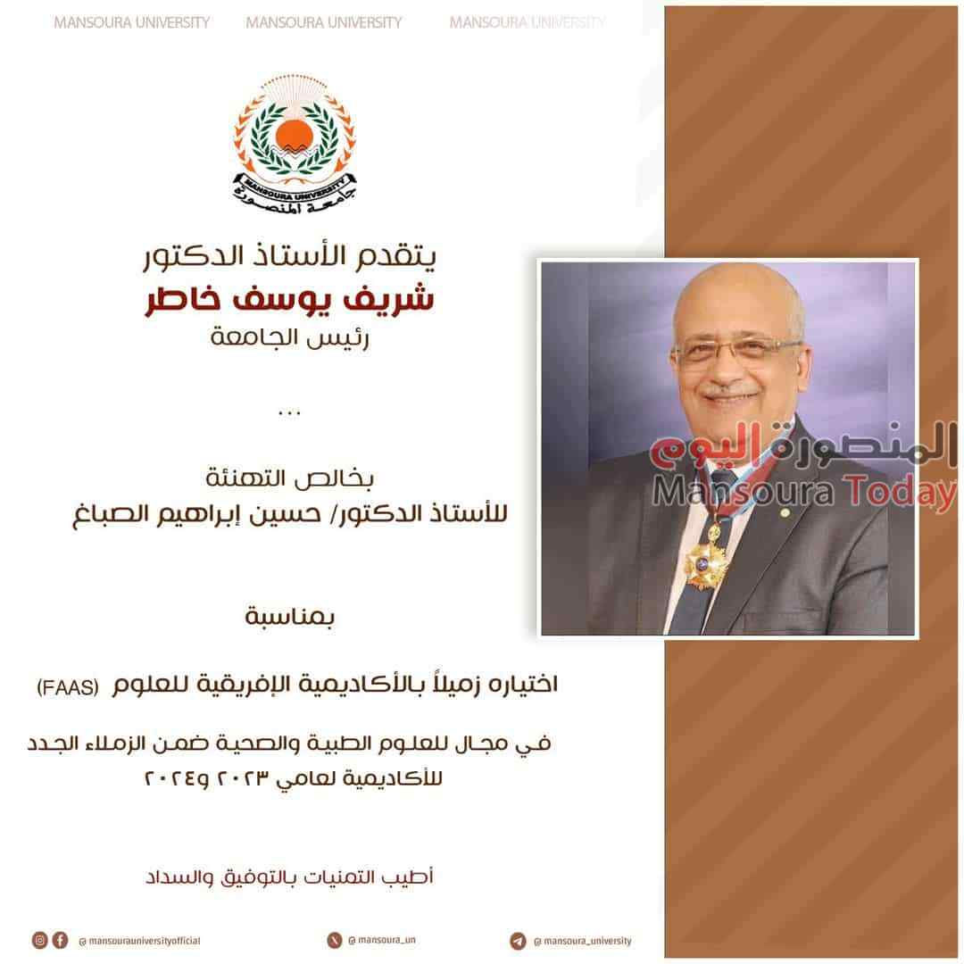 تتمنى جامعة المنصورة للأستاذ الدكتور حسين الصباغ دوام التوفيق والسداد في مسيرته العلمية.