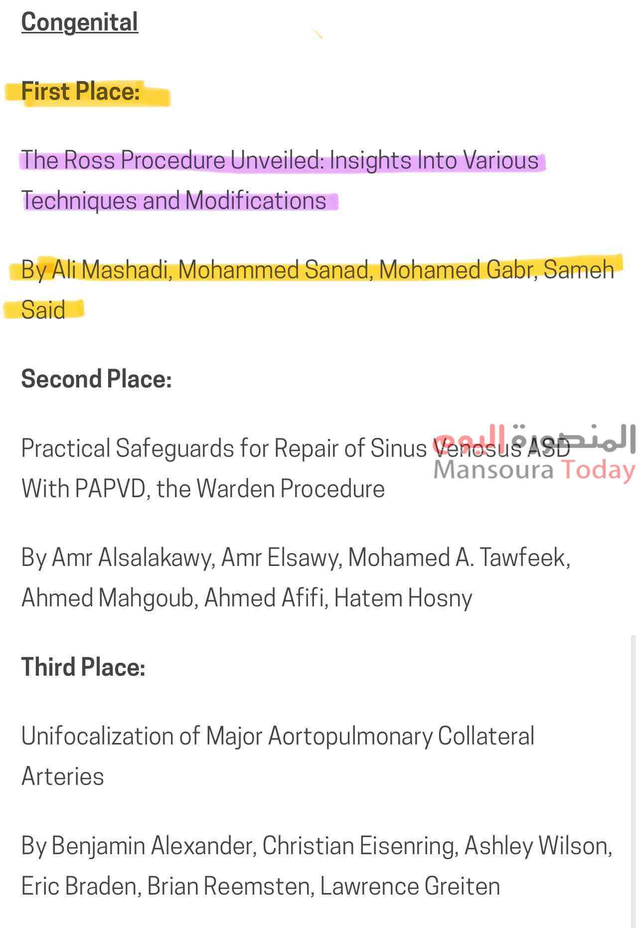 إنجاز عالمي جديد يُضاف إلى رصيد جامعة المنصورة بفوز فريق بحثي دولي مشترك من الجامعة بالمركز الأول في مسابقة الفيديوهات الجراحية التعليمية لعام 2025، التي تنظمها الشبكة العالمية لجراحة القلب والصدر (CTSNet)، وذلك في فئة جراحات العيوب الخلقية للقلب.