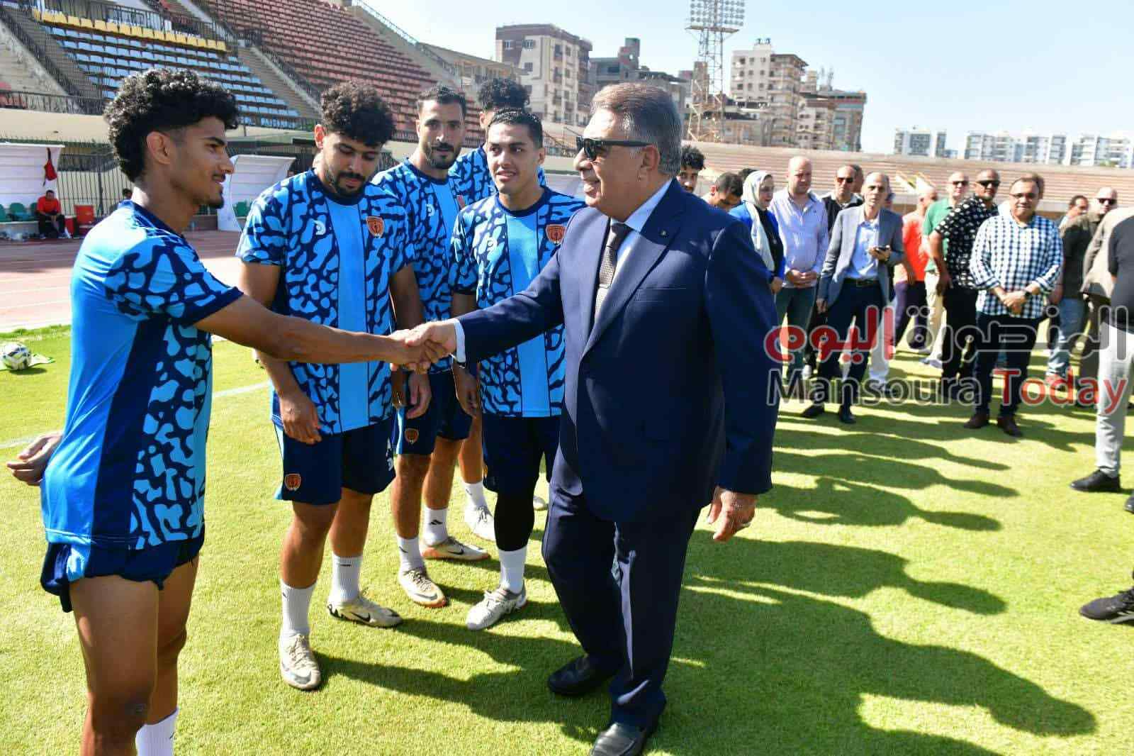 وصافح محافظ الدقهلية، لاعبي الفريق وأعضاء الجهاز الفني والإداري والطبي وأعضاء مجلس الإدارة ومدرب الفريق، وشد من أزرهم وحثهم على البذل والعطاء، وأكد لهم أن كرة القدم هي أكثر الألعاب جاذبية للجماهير، مشددا على أن الفريق يحتاج إلى إرادة قوية لتحقيق الفوز وإسعاد جماهيره في أنحاء مصر وليس الدقهلية فحسب، فاجتهدوا وبقدر التعب والعرق ستحققون النصر الذي تنتظره جماهير نادي المنصورة، مؤكدا لهم أن نجوم الكرة على مستوى العالم خرجوا من بينكم.