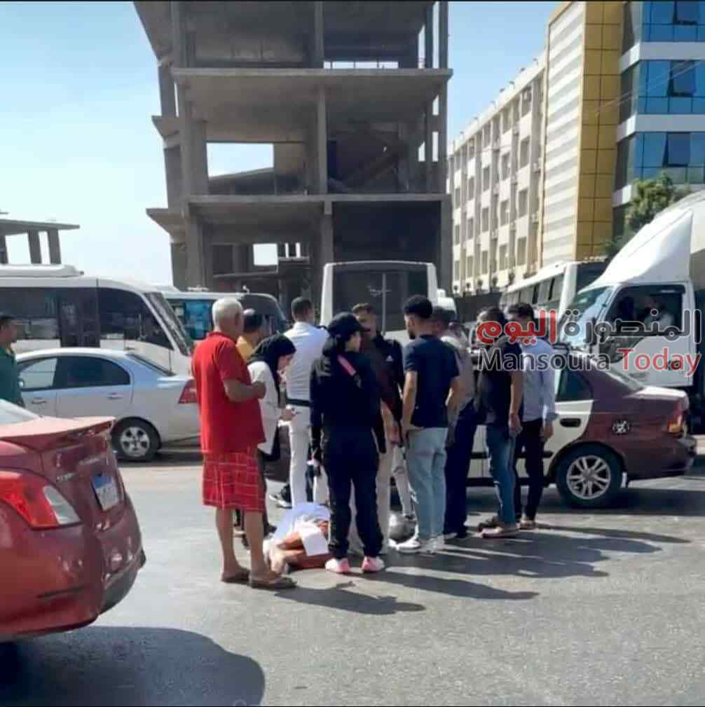 صدمت سيارة مسرعة سيدة اثناء عبورها الطريق الدائري بالمنصورة امام مدارس الصفوة.