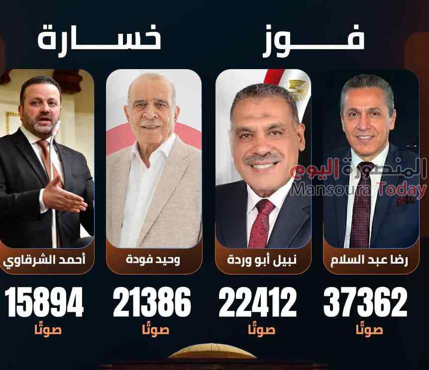 بهذه النتيجة فاز كلا من رضا عبد السلام ونبيل ابو وردة بمقعدى بندر المنصورة.