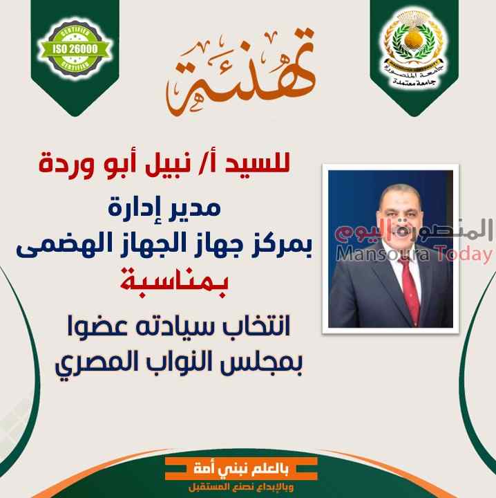 وأشار الدكتور شريف خاطر إلى أن جامعة المنصورة تفخر بأبنائها الذين يواصلون تمثيلها في المحافل التشريعية والتنفيذية، مؤكدًا أن وجود الأستاذ نبيل أبو وردة تحت قبة البرلمان يُعد إضافة نوعية لما يمتلكه من خبرات إدارية وفنية في إدارة المراكز والمستشفيات الجامعية، بما يسهم في إثراء النقاشات التشريعية ودعم القضايا المرتبطة بتحسين الخدمات الصحية والتنمية المجتمعية.