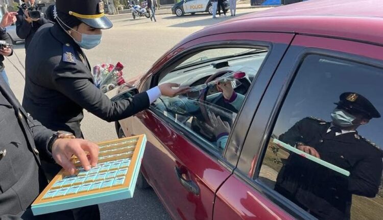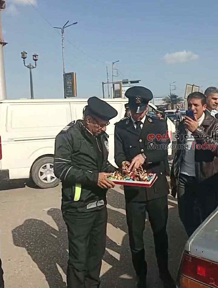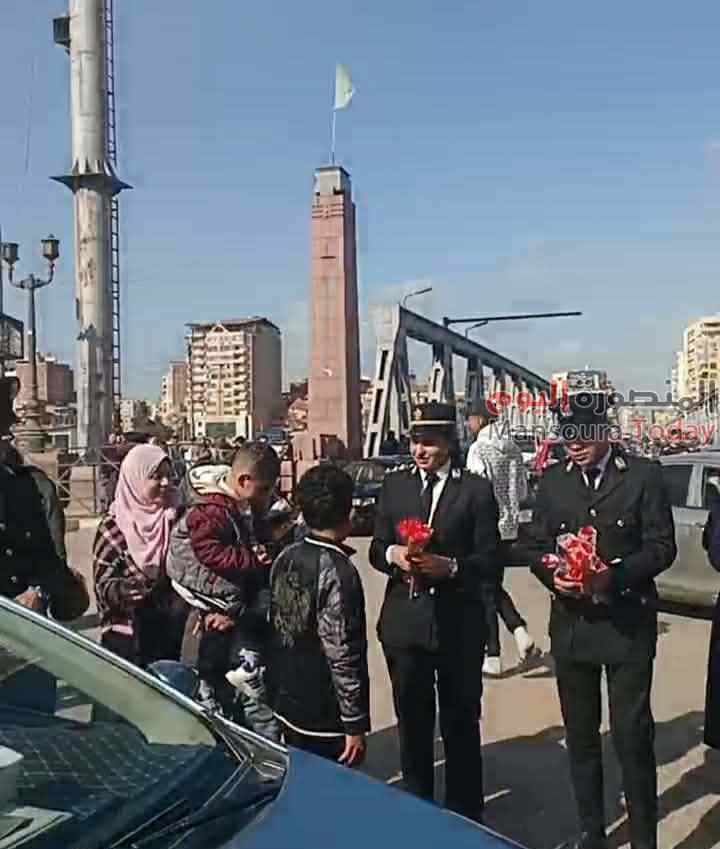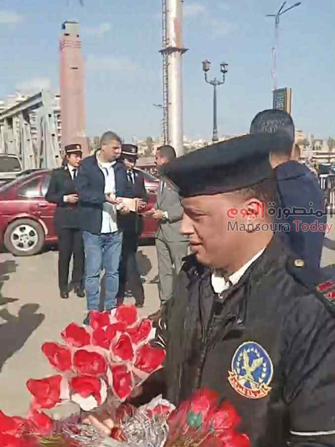 حيث انتشر رجال شرطة المرور امام كوبرى طلخا ، واستوقغوا السيارات والمارة لاعطائهم ورود وزهور وشيكولاته ، وحرص المواطنون علي تهنئتهم بعيد الشرطة الذي يوافق ال 25 من يناير.