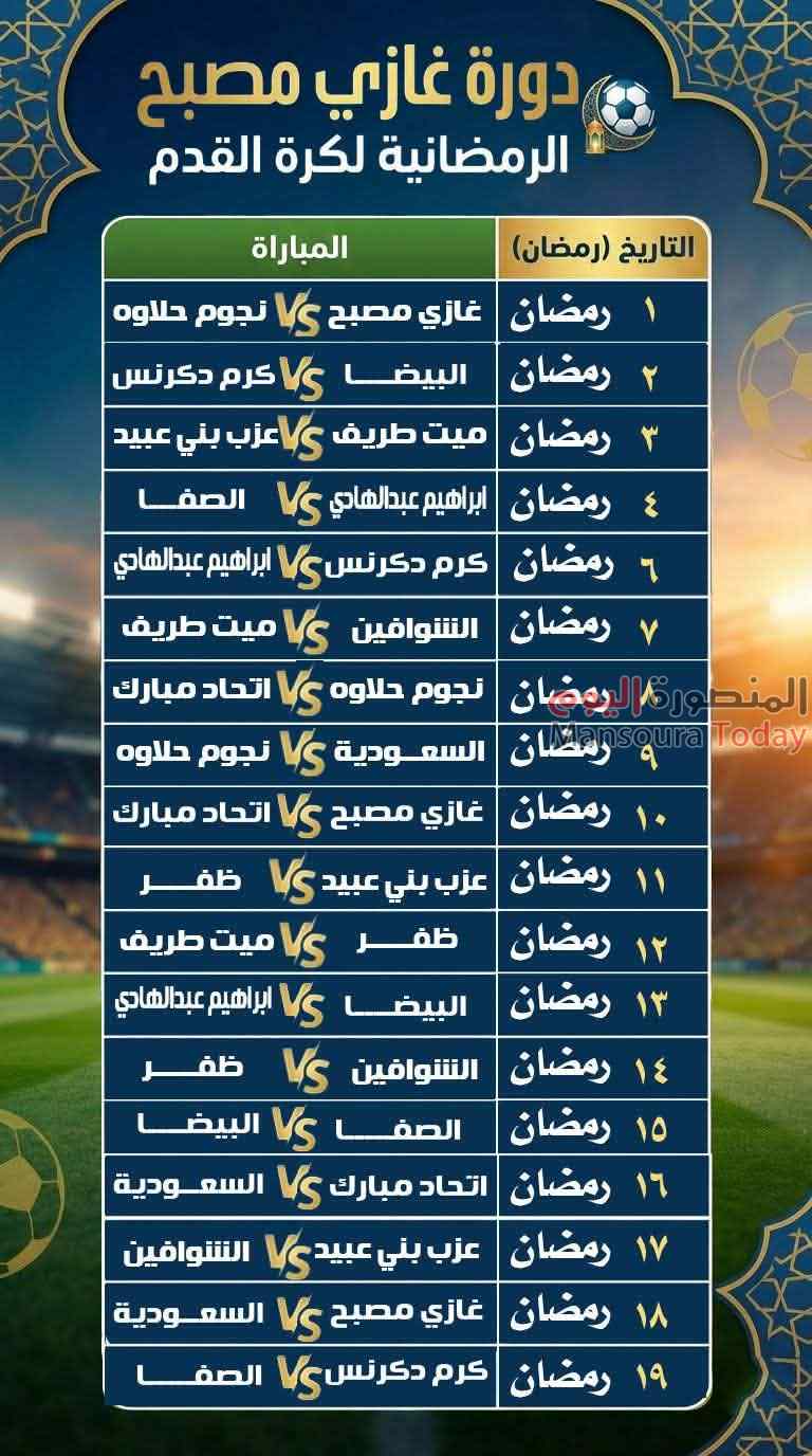 يتم اليوم افتتاح دوره غازى مصبح الرمضانية الكبرى التي تعد من أقدم الدورات الرمضانية بمحافظة الدقهلية ، وتقام بانتظام كل عام منذ 10 سنوات ، هذه الدورة هي الحادية عشر.