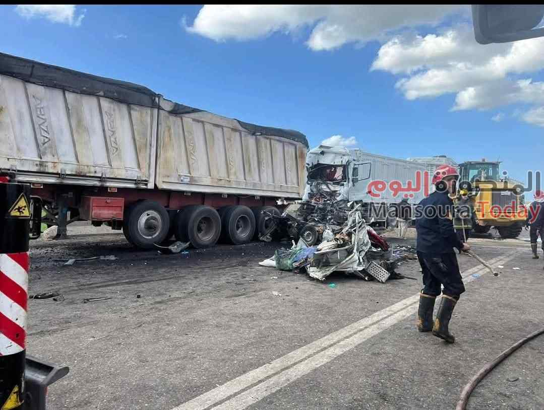 وقع الحادث اثناء استقلال العمال لسيارة ربع نقل حيث دهستهم سيارة نقل ثقيل ، وتم تحرير محضر بالواقعة واتخاذ الاجراءات القانونية اللازمة.