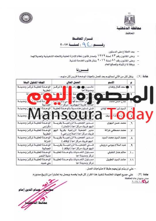 أصدر حسام الدين إمام محافظ الدقهلية القرار رقم 94 وأيضاً القرار رقم 95 لسنة 2017 بشأن إحالة بعض العاملين للنيابة العامة وإيقافهم عن العمل احتياطيا لمدة ثلاثة أشهر أو لحين انتهاء التحقيقات بالنيابة العامة مع صرف نصف الأجر بمركز ومدينة أجا وأيضاً نقلهم من مكان عملهم إلي مكان آخر .