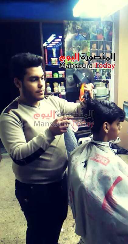 وجد أحمد محمود ” حلاق ” من منطقة جديلة التابعة لحى شرق المنصورة بمحافظة الدقهلية ، طريقة مبتكرة لكنها غريبة، لقص شعر زبائنه من الرجال، وذلك عبر إشعال النار في الشعر .