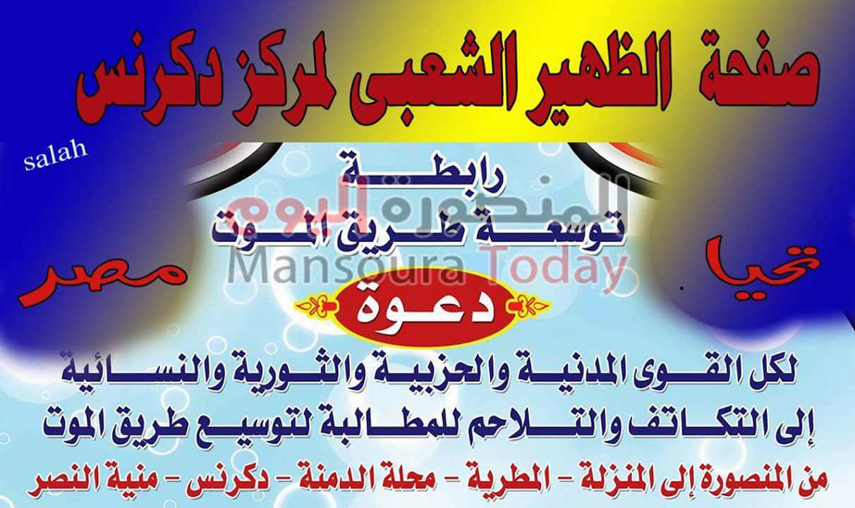 وقد دعت الرابطة عبر جروب رسمى عبر موقع التواصل الإجتماعى “فيس بوك” تحت أسم “الظهير الشعبى لمركز دكرنس” كافة القوى السياسية بالمركز للتعاون والتكاتف للمطالبة بتوسيع الطريق المتعارف عليه إعلامياً بطريق الموت.