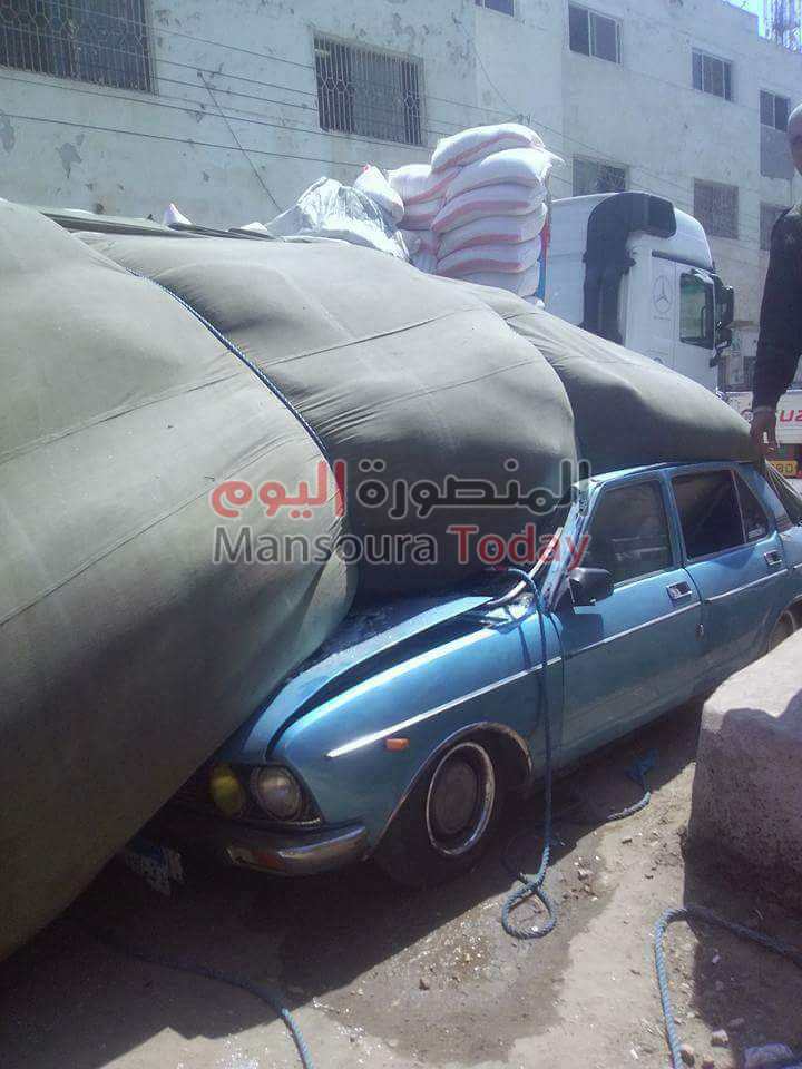 انقذت العناية الالهية صاحب سيارة ملاكي من الموت بعد انقلاب حموله ذرة من شاحنه نقل علي سيارته،