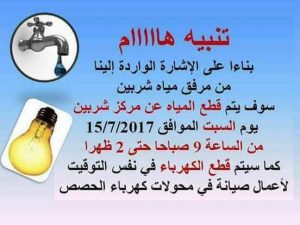 أعلنت رئاسة مزركز ومدينة شربين، التابعة لمحافظة الدقهلية، ، عن انقطاع التيار الكهربائي عن المدينة، غدا السبت 15 يوليو لمدة6 ساعات، بالإضافة إلى انقطاع المياه في نفس التوقيت؛ لإجراء صيانة بمحطات كهرباء الحصص.