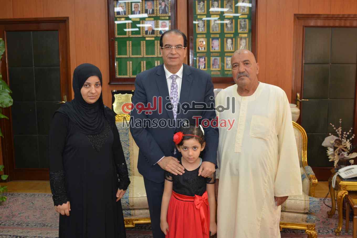حيث استقبل ابنة الشهيد محمد محمد محمود ابن قرية الرياض مركز منية النصر، وجدها، واستمع المحافظ مطولا للاسرة ، وعلى الفور قرر اطلاق اسم الشهيد على أحد الميادين الكائن على الطريق بين قرية برمبال القديمة والرياض ، كما وجه بتوفير كل الدعم اللازم لتعليم الابنة وتوفير كل الرعاية الاجتماعية والصحية لجدها ،وتوفير فرصة عمل للزوجة مؤكدا لوالد الشهيد” ابنك بطل وشرف لكل مصر”.