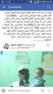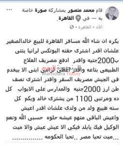 قام محمد منصور الموظف بوزارة الرى والمقيم بميت تمامه مركز منية النصر بالدقهلية ، بالاعلان اليوم على حسابه الشخصى على فيس بوك بأنه سيتجه غدا الى القاهره لبيع ابنه خالد الذى يبلغ من العمر عامان وذلك لعدم قدرته على تحمل أعباء الحياه فى الوقت الحاضر .