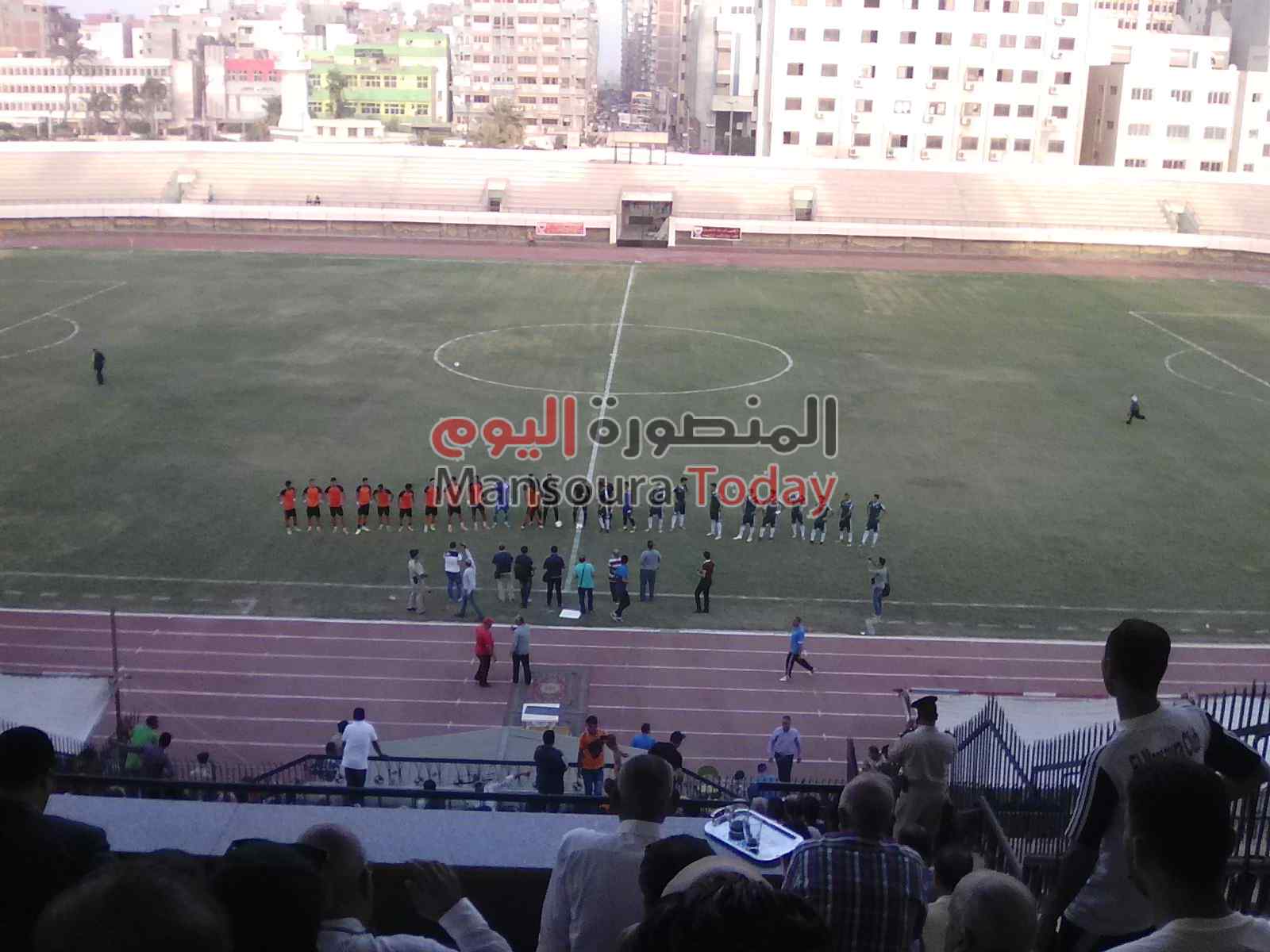 بعدها يرسل حسام عبد العال قذيفه قوية يتصدي لها حارس المنصورة ببراعه لينتهي الشوط الاول بالتعادل السلبي .