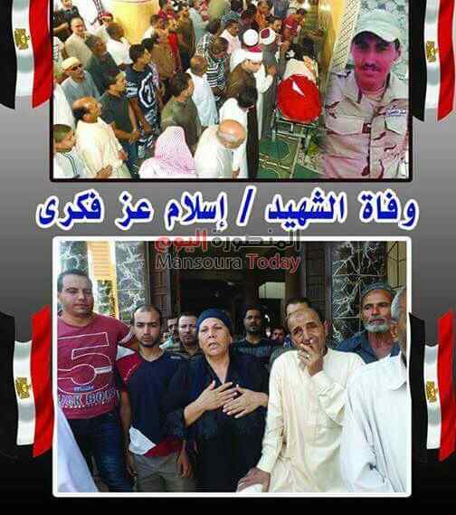 شيع الآلاف بقرية المعصرة التابعة لمركز بلقاس دقهلية جثمان الشهيد إسلام عز فكري، مجند بالقوات المسلحة يتقدمهم اللواء احمدرأفت رئيس مركز ومدينة بلقاس وعدد من القيادات الأمنية والتنفيذية بالمحافظة .