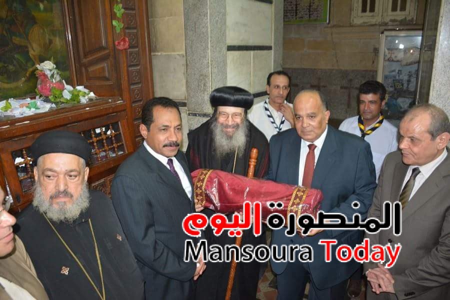 كما كان في استقباله بكنيسة مارجرجس الأنبا بيشوي النائب البابوي لدير مار جرجس والأنبا داوود أسقف المنصورة والأنبا صليب أسقف ميت غمر ودقادوس والقمص مكاري غبريال دير الشهيد مار جرجس وفضيلة الشيخ طه زياده وكيل وزارة الأوقاف وفضيلة الشيخ السيد سراج رئيس الإدارة المركزية للأزهر وعدد من أعضاء مجلس النواب ولفيف من أعضاء الجهاز التنفيذي وقد ألقى كل من وكيل الأوقاف والأزهر والأنبا بيشوي كلمة أكدوا فيها على الوحدة الوطنية التي تنعم بها مصر داعين الله أن يديمها علينا.