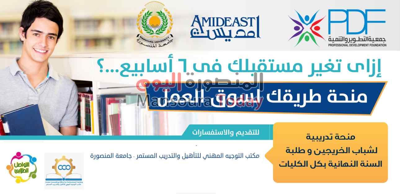 أعلن مكتب التوجية المهني للتأهيل والتدريب المستمر بجامعة المنصورة عن بدء التسجيل في المنحة التدريبية “طريقك لسوق العمل” لخريجي جامعة المنصورة و طلاب السنة النهائية بكل الكليات بالتعاون مع لجنة التواصل الطلابي بالجامعة وهيئة الأمديست وجمعية التطوير والتنمية.