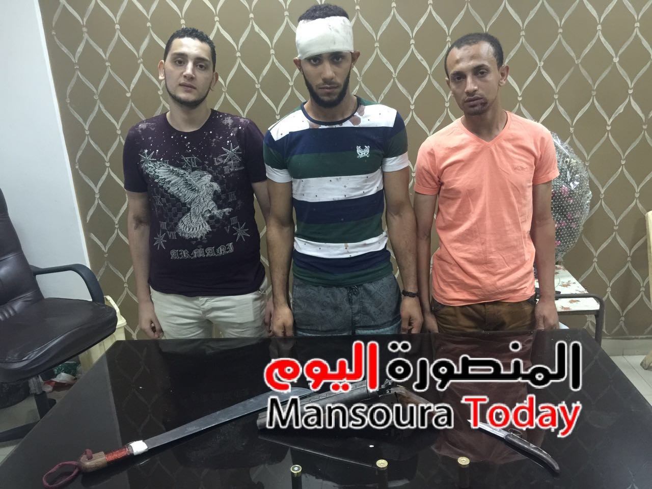 وعلى الفور أمر بعمل حملة لضبط المتهمين وأسفرت الحملة عن ضبط كل من مدحت عاطف مصطفى إبراهيم س 19 طالب وبحوزته سلاح ناري [ فرد خرطوش + 3 طلقات ] والسيد العربي السيد محمد س 31 تاجر سيارات وبحوزته سلاح ابيض [ مطواة ] ومحمد س 25 صاحب فرش ملابس وبحوزته سلاح أبيض [ سنجه ] وجميعهم يقيمون شارع عبد السلام عارف دائرة قسم أول المنصورة .
