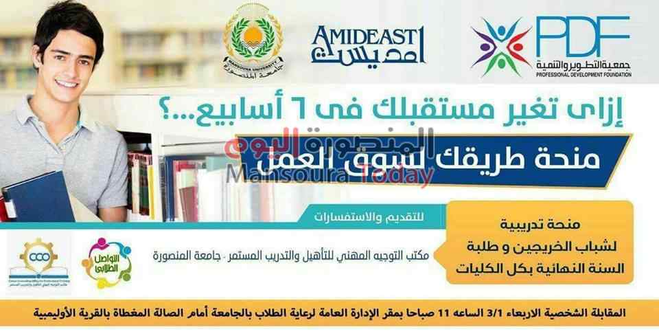 أعلن مكتب التوجية المهني للتأهيل والتدريب المستمر بجامعة المنصورة عن اجراء المقابلة الشخصية لاستكمال إجراءات القبول بالمنحة التدريبية “طريقك لسوق العمل” لخريجي جامعة المنصورة و طلاب السنة النهائية بكل الكليات بالتعاون مع لجنة التواصل الطلابي بالجامعة وهيئة الأمديست وجمعية التطوير والتنمية