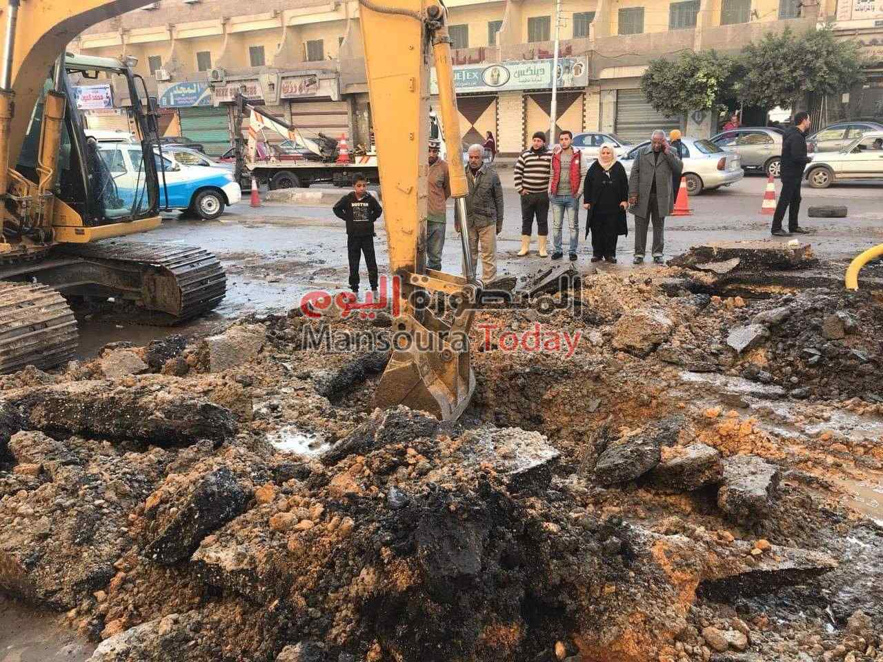بالصور.. إصلاح كسر بخط طرد صرف صحي رئيسي بقطر 500مم بالمنصورة