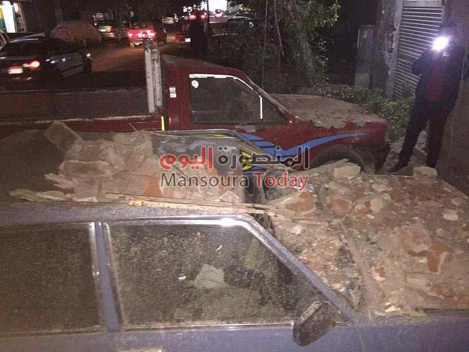شهدت منطقة الحسنية بالمنصورة، انهيار سور سطح عقار كائن بالقرب من موقف التلاجة مما أدى إلى تحطم سيارتين