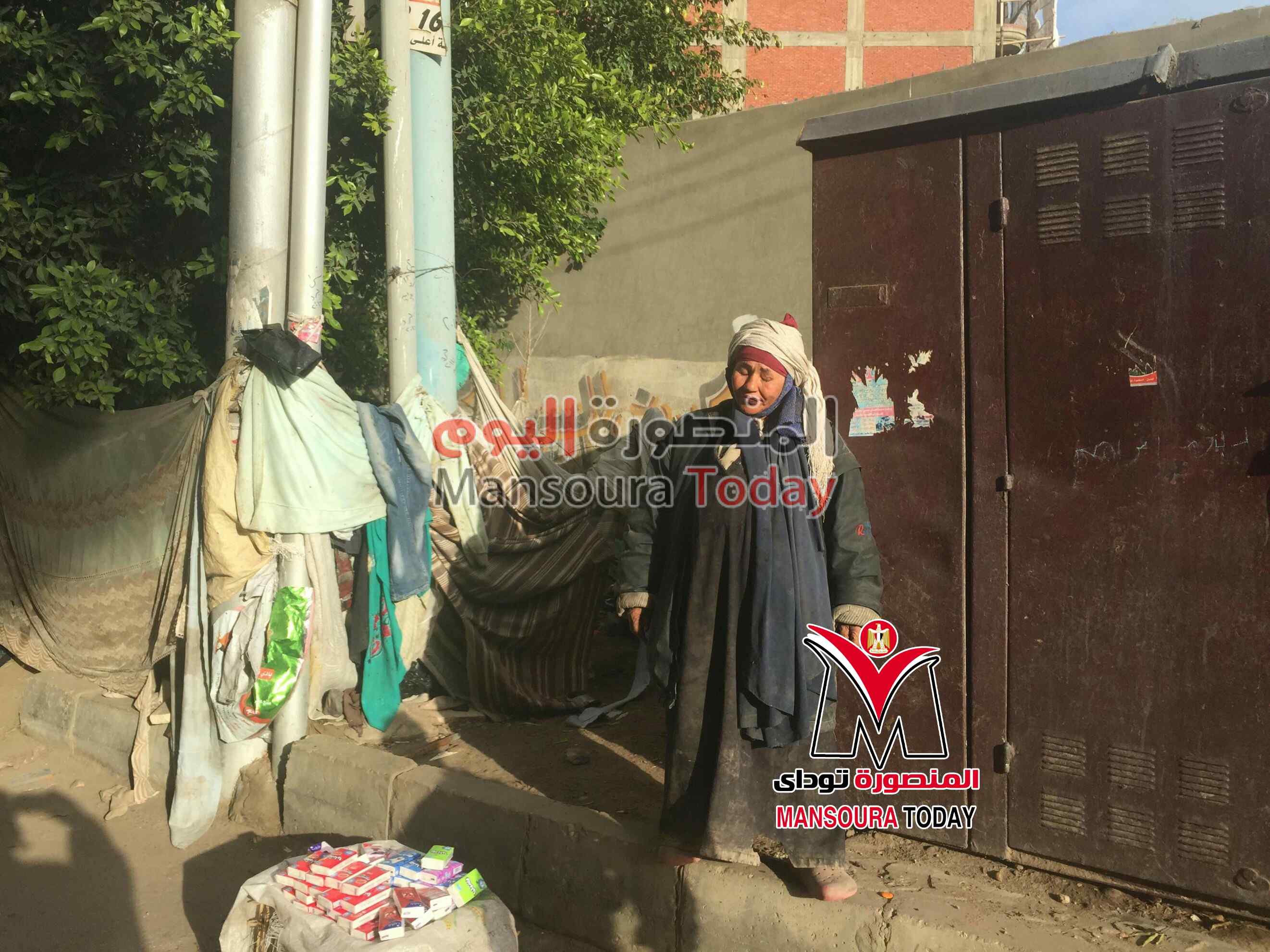 الحاجة ثريا التي تعيش علي الرصيف بشارع قناة السويس بمدينة المنصورة ، تعتبره منزلها الذي تقيم فيه وتحتمي به، تنام علي الأرض وتضع رأسها علي “شيكارة” بها تراب وطوب، لتريح جسدها، والناس يسيرون بجانبها وهي نائمة لا تهتم بما يحدث حولها .